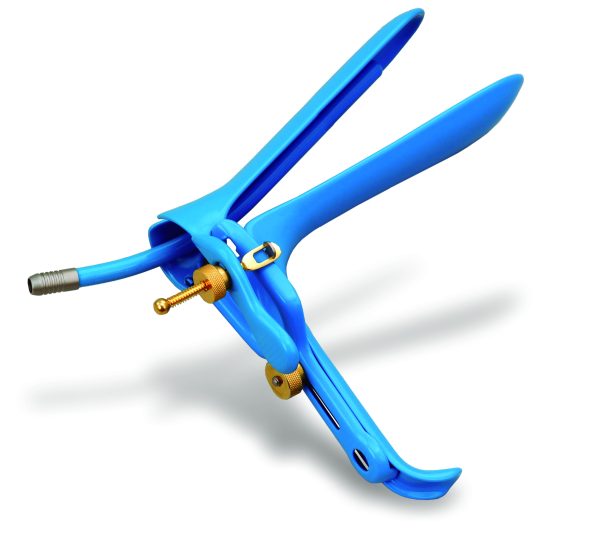 Extra långt Gravesspekulum, extralarge, 15 cm. Spekula för slyngdiatermikonisering (LETZ/LEEP) i rostfritt stål med en blå, elektriskt isolerande ytbeläggning i nylon och med en integrerad rökutsugskanal. Spekulumslang ESU-502 ansluts till spekulats rökutsugskanal.