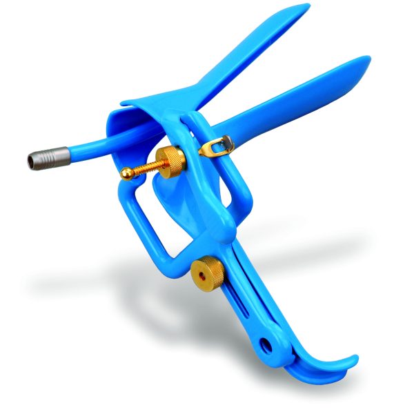 View-maxi Pedersonspekulum, large, 12 cm x 2,4 cm, diameter öppning 7 cm. Spekula för slyngdiatermikonisering (LETZ/LEEP) i rostfritt stål med en blå, elektriskt isolerande ytbeläggning i nylon och med en integrerad rökutsugskanal. Spekulumslang ESU-502 ansluts till spekulats rökutsugskanal.