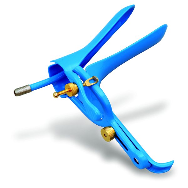 Wide view Gravesspekulum, medium, 11 cm. Spekula för slyngdiatermikonisering (LETZ/LEEP) i rostfritt stål med en blå, elektriskt isolerande ytbeläggning i nylon och med en integrerad rökutsugskanal. Spekulumslang ESU-502 ansluts till spekulats rökutsugskanal.